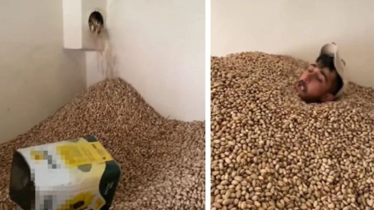 Siirt’te fıstığının depolandığı yere girip, fıstıkların içinde yüzen kişi o anları sosyal medya hesabından paylaşmıştı.