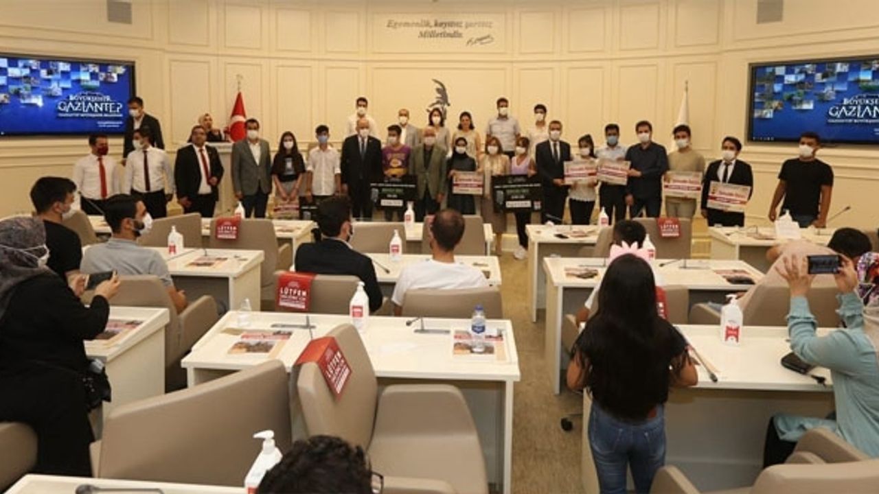 REFORM HABER- Gaziantep’in düşman işgalinden kurtuluşunun 100’üncü yılı etkinlikleri kapsamında çalışmalarını sürdüren Gaziantep Büyükşehir Belediyesi Kültür ve Turizm Daire Başkanlığı, İl Millî Eğitim Müdürlüğü’yle ortaklaşa hareket ederek “Gaziantep’in Bayrak Şehidi Şahin Bey’e Mektup” ve “Gaziantep ve Gaziantep Savunması Temalı Rap Müziği Yarışması” adlı organizasyonlarında derece alan isimlerin ödüllerine alması için Meclis Toplantı Salonu’nda tören gerçekleştirdi. Törende rap şarkılarını seslendiren yarışmacılar büyük bir beğeniyle dinlenirken Şahinbey için yazılan mektuplar okunduğu sırada ise salonda duygu dolu anlar yaşandı.