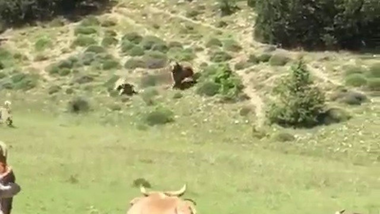 Erzurum’un Oltu ilçesinde ayının sürüye saldırısını kangal köpekleri önledi. Saldırı anı cep telefonu kamerası ile anbean görüntülendi.