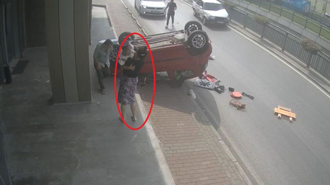 Frenlese de duramayan kadın sürücü, karşısına çıkan otomobile çarpıp ardından metrelerce savrularak kaldırımda ters döndü. Ters dönen otomobilde yan koltukta oturan küçük kız refleks ile kendini dışarı attı. Dizlerinden yaralanan kızı gören annesi ise kazayı unutup hemen yanına giderek kızını kucağına aldı.