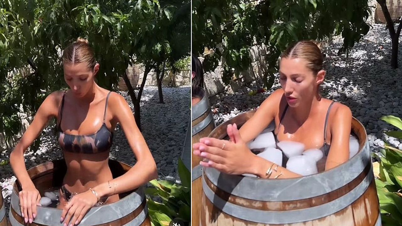 Ünlü manken arkadaşıyla birlikte soğuk su dolu fıçıya girdi ve o anları da sosyal medyadan yayınladı.