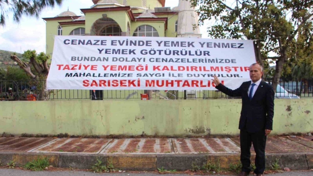Hatay’ın İskenderun ilçesinde muhtar Özcan Kaya, ‘Cenaze evinde yemek yenmez, yemek götürülür’ diyerek mahallenin her yerini cenaze yemeğinin kaldırıldığını içeren afişlerle donattı.