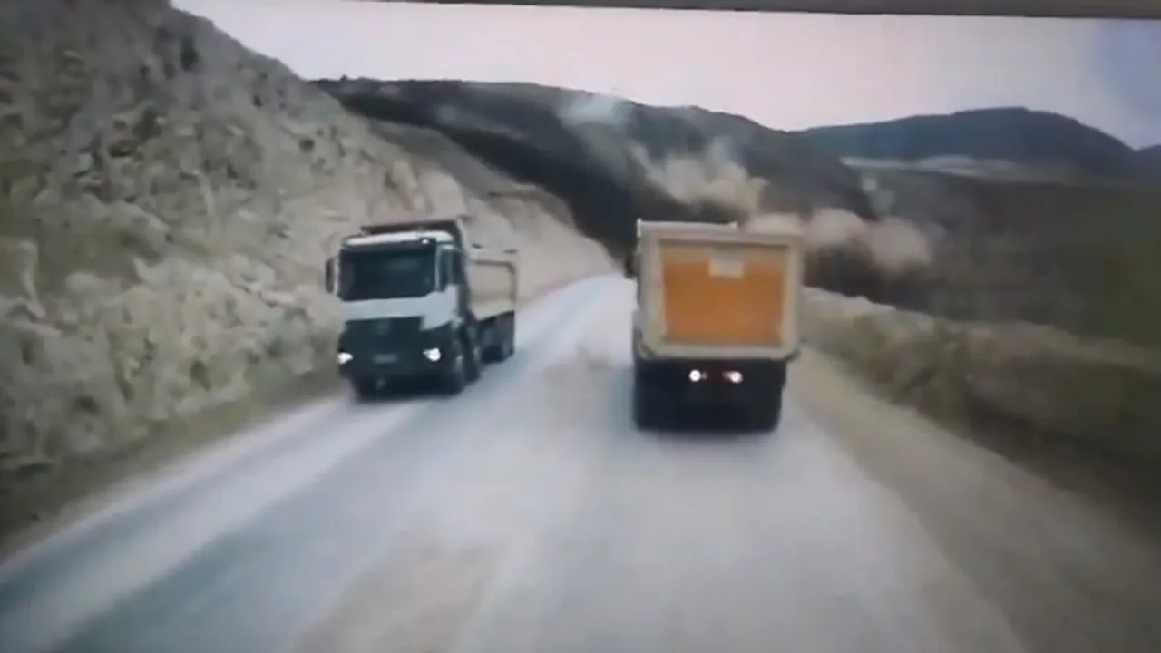 Görüntüde toprak yığınının üzerlerine geldiğini gören kamyon şoförlerinin manevra yaparak felaketten son anda kurtulduğu görüldü.