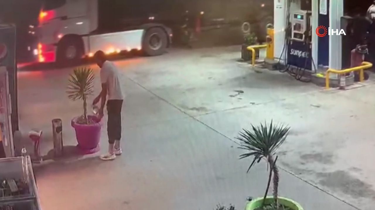 Bursa’nın Harmancık ilçesindeki Kışmanlar köyündeki yangını çıkardığı iddiasıyla gözaltına FETÖ üyeliği sebebiyle Hava Kuvvetlerinden ihraç edilen 30 yaşındaki Ufuk Aytekin’in ilçedeki bir benzin istasyonundan 5 kiloluk pek şişelerle benzin alırken görüntüleri ortaya çıktı. 03 HK 184 plakalı kamyonet ile istasyona gelen şüphelinin aldığı 5 litrelik pet şişelerdeki suları önce çiçek saksısına döktüğü ardından da pompaya geçip benzin aldığı görüldü.