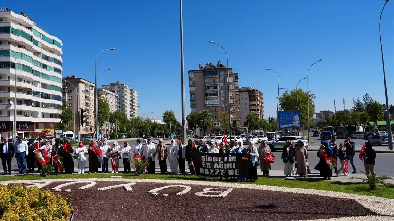 Gaziantep'te 15 Temmuz Demokrasi Meydanı'nda bir araya gelen kadınlar, 'Gazze İçin Sessiz Çığlık' zinciri oluşturdu.