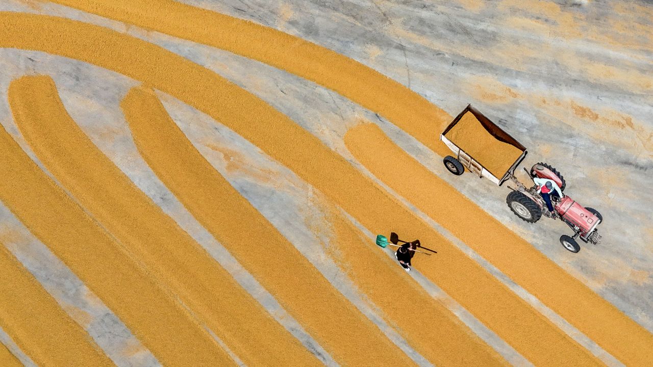 Kurutma sürecinde traktörlere takılan özel gereçler, serili buğday üzerinde desenler oluşturuyor.