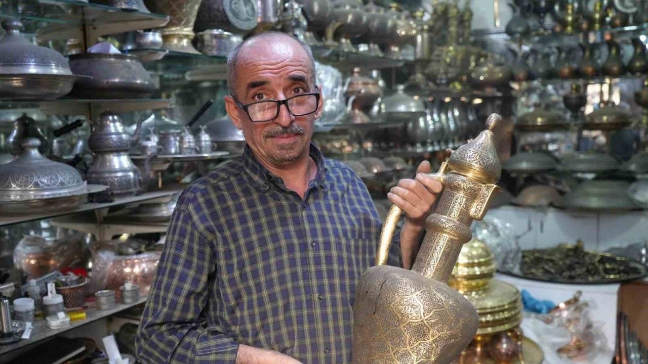 Gaziantep’teki tarihi Tütün Hanı’nda 45 yıldır bakıra hayat veren usta, geçmişten günümüze gelen eşsiz eserlerden biri olan ve "Çeşm-i Bülbül" adıyla bilinen bakır ibrikleri 100 bin TL’den satıyor.
