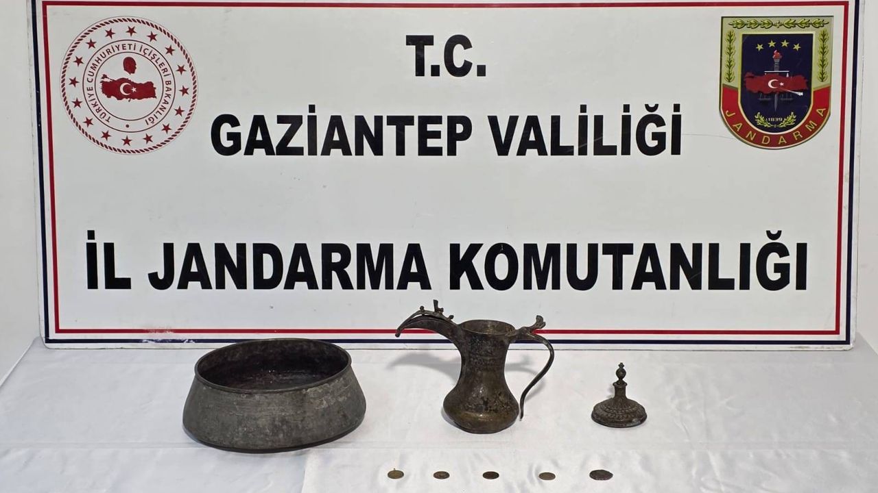 Konuya ilişkin yapılan açıklamada, “Gaziantep İl Jandarma Komutanlığınca, tarihi eser kaçakçılığının önlenmesine yönelik Gaziantep Cumhuriyet Başsavcılığı koordinesinde Nizip ve Şahinbey ilçelerinde icra edilen önleyici kolluk devriyesi esnasında define bulmak amacıyla izinsiz kazı yaptığı tespit edilen Ş.T., M.Ç., K.B., H.B. ve M.E. isimli şüpheliler suçta kullandıkları malzemeleri ile birlikte suçüstü yakalanarak gözaltına alınmıştır. Yapılan aramada;