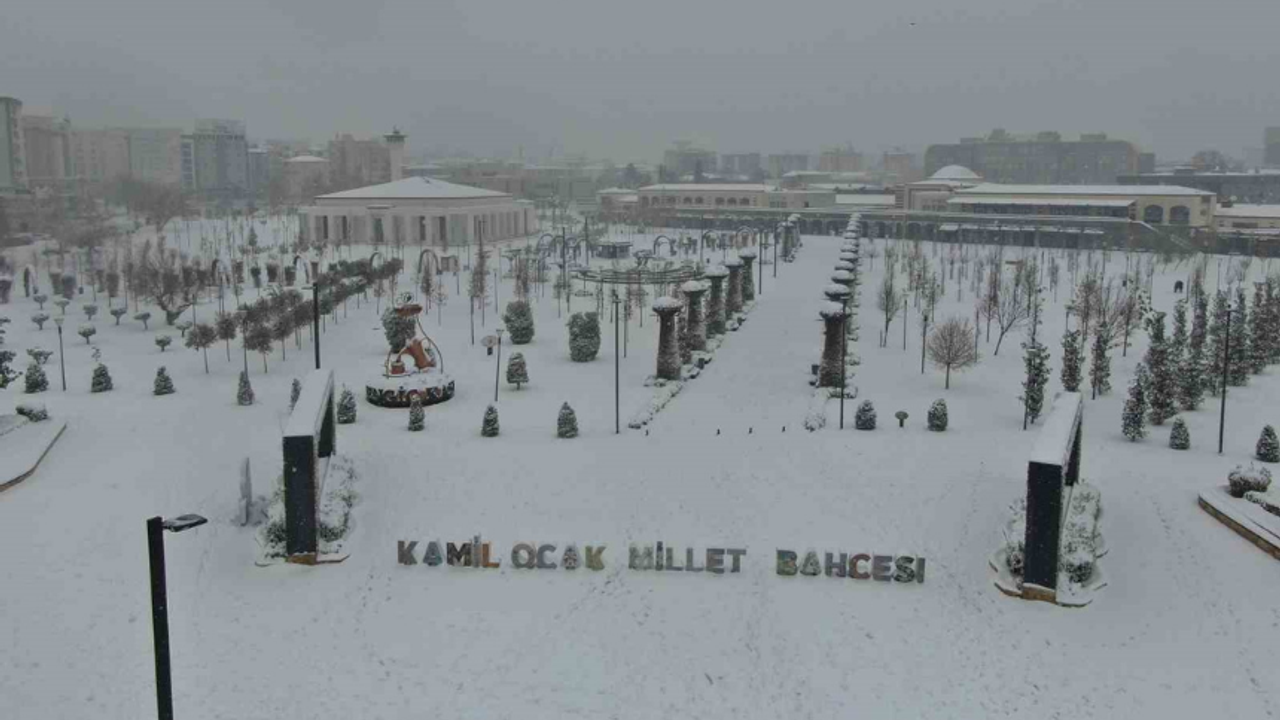Gaziantep'in kar yağışı sonrası beyaza bürünen tarihi yerleri ve kent merkezindeki Kamil Ocak Millet Bahçesi dron ile görüntülendi.