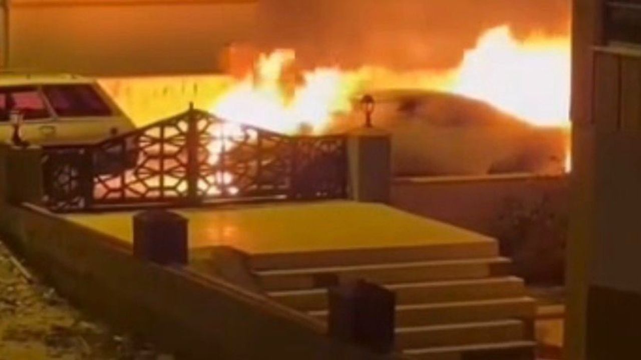 Gaziantep'in Nizip ilçesinde park halindeki lüks otomobil gece saatlerinde alev alev yanarak kullanılamaz hale geldi.
