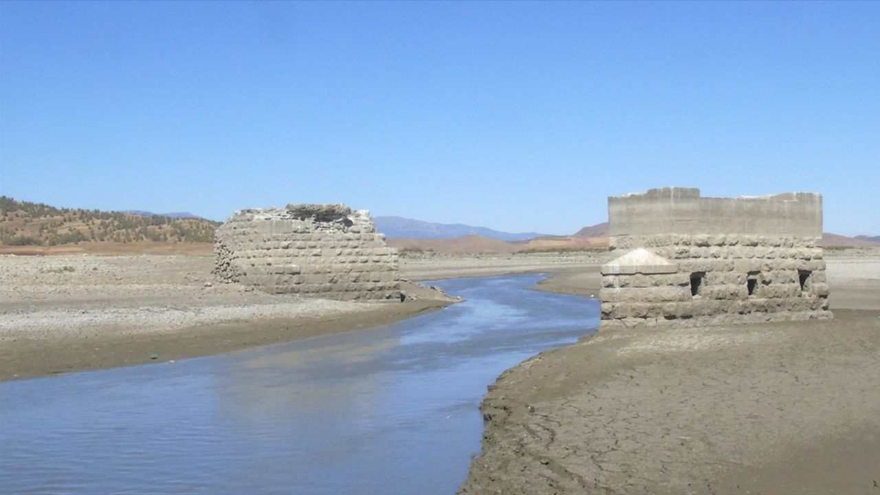 Kuraklık nedeniyle suların çekilmesinin ardından tarihi köprünün ayakları yeniden gün yüzüne çıktı.