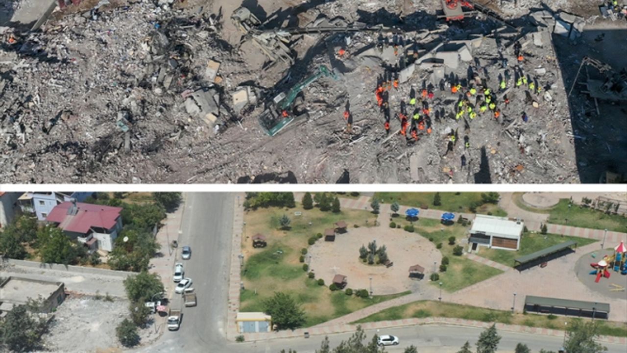 Kent merkezinde, deprem sonrası yıkık binaların görüldüğü bölgelerde, enkazın kaldırılmasıyla büyük boşluklar oluşması dron ile "öncesi ve sonrası" şeklinde kaydedildi.