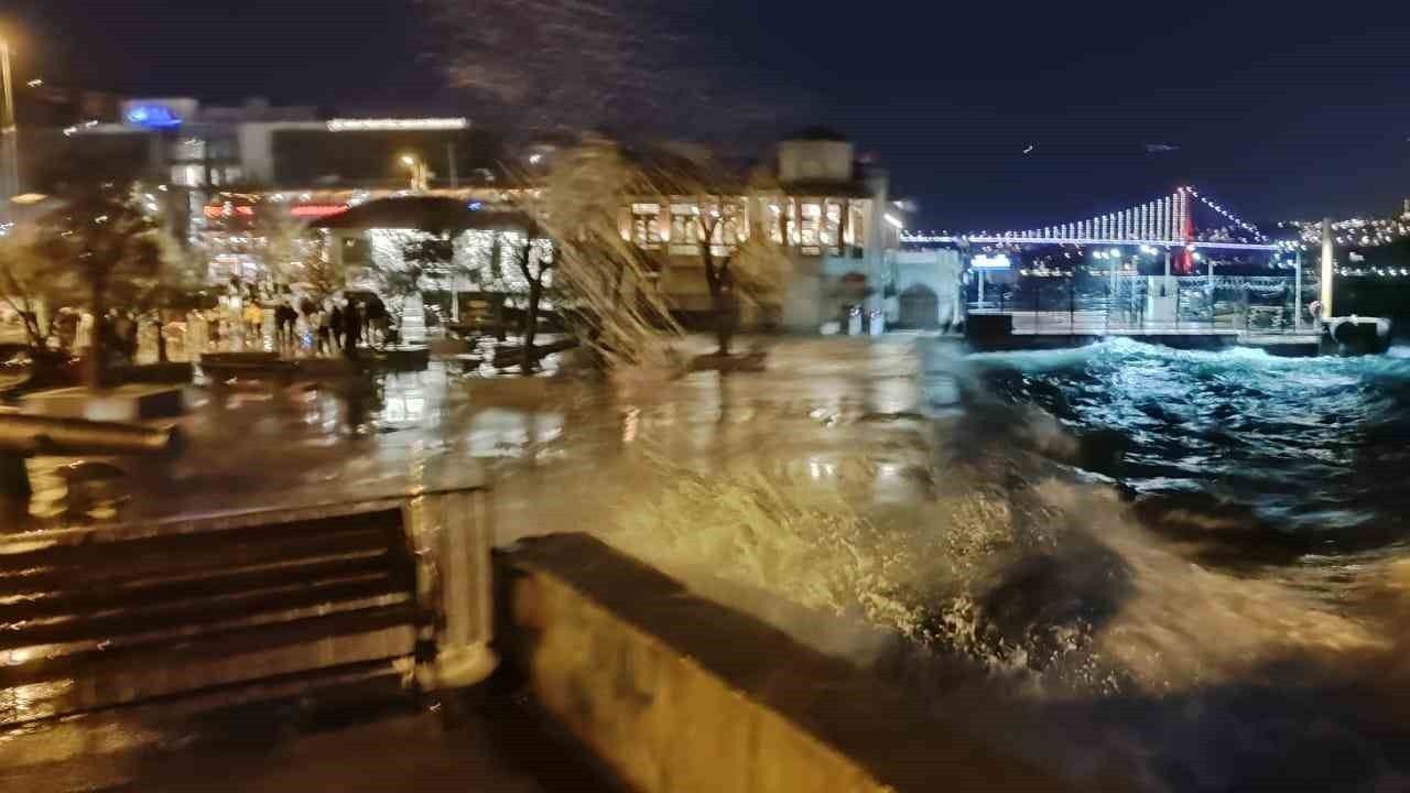 Marmara Denizi’nde beklenen kuvvetli fırtına etkisini gösterdi. Fırtınanın etkisiyle Beşiktaş sahiline vuran dalgalar 2 3 metre boyuna ulaştı. Şehir Hatları ve İDO seferleri iptal edildi.