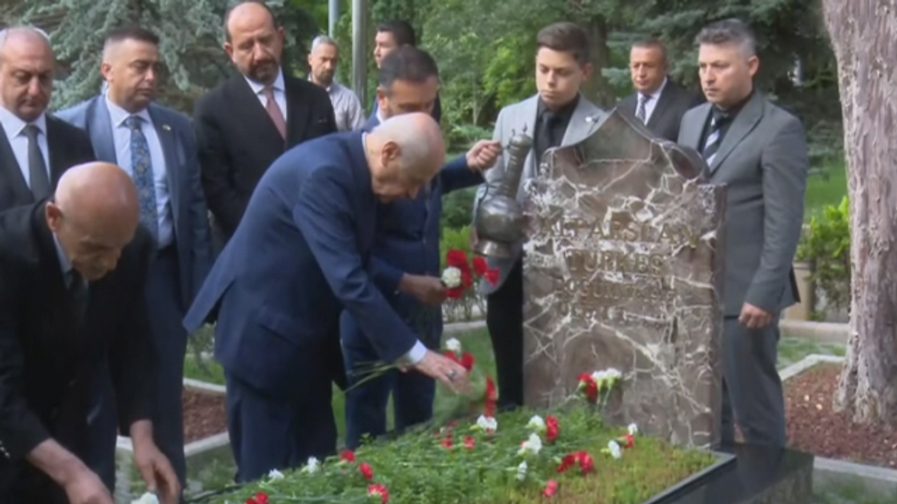 Devlet Bahçeli, Kur'an-ı Kerim tilavetinin ardından Türkeş'in kabrine karanfil bıraktı, bakır ibrikle su döktü. Ardından bayram programı için kabristan ayrılan Bahçeli, MHP Genel Merkezi'nde partililerle bayramlaşacak.