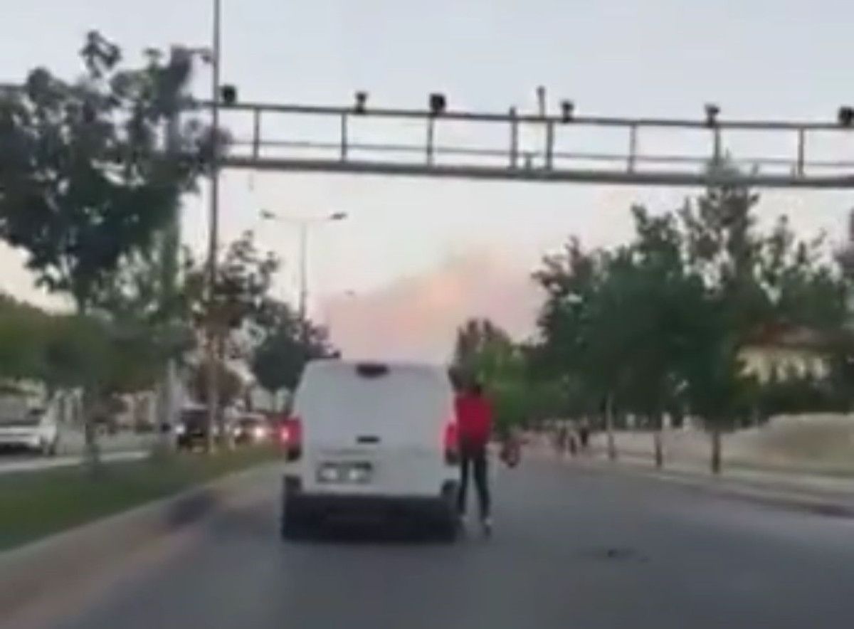 Gaziantep'in Şahinbey ilçesinde şehir içi trafiğin en yoğun olduğu saatlerde hafif ticari araca tutunarak dakikalarca ilerleyen patenli genç, hem kendi hayatını riske attı hem de diğer sürücüler için tehlike oluşturdu.