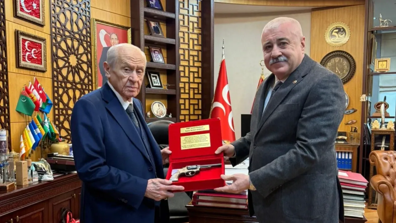 Sermet Atay, Genel Başkan Bahçeli’ye İkinci Dünya Savaşı’ndan kalma, 1942 model Smith & Wesson marka antika tabanca hediye etti. Özel kutusu içerisinde sunulan antika tabancanın, tarihi değeriyle öne çıktığı belirtildi.