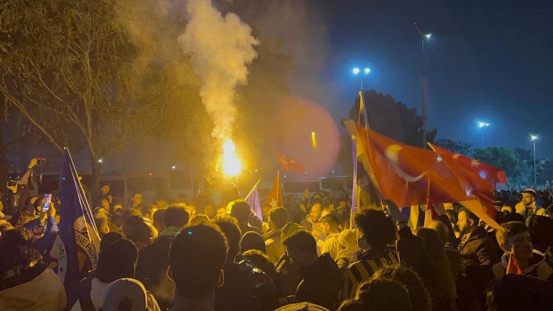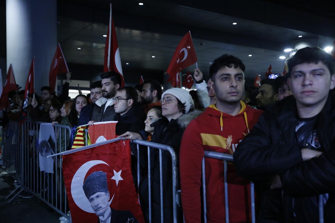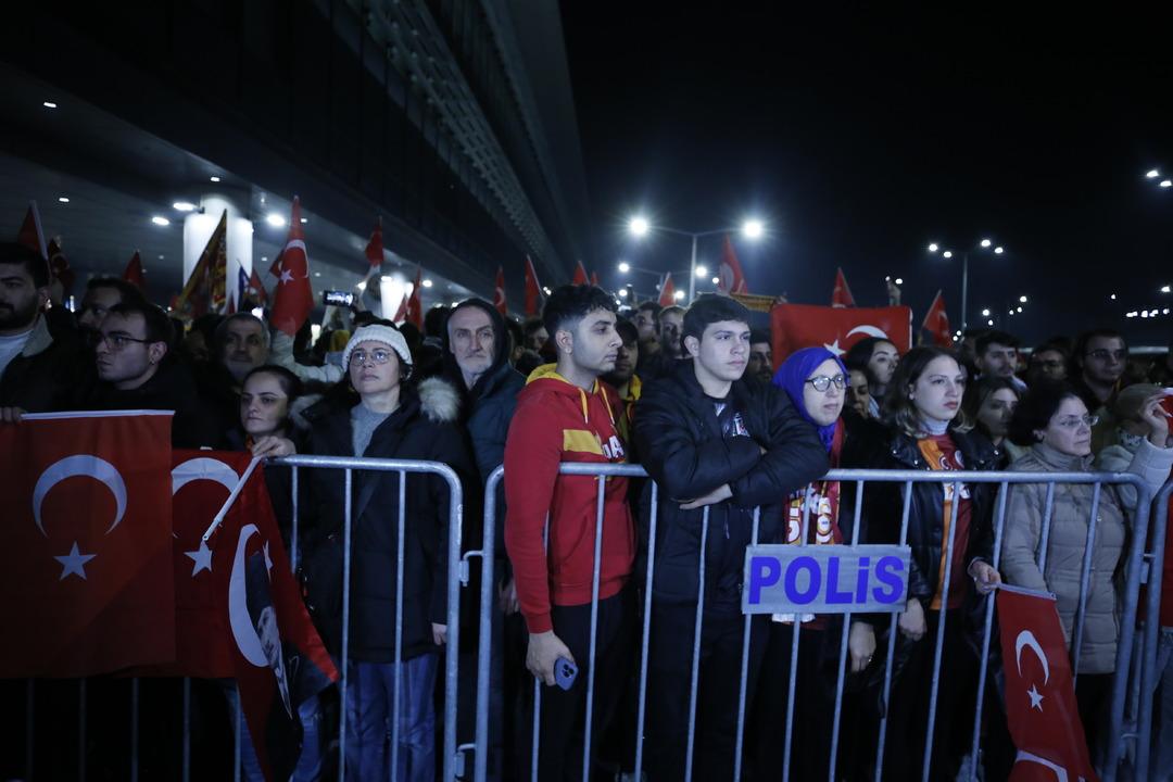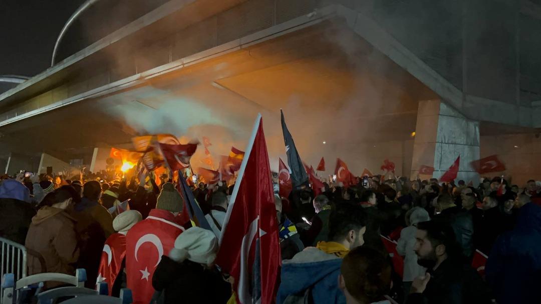 İstanbul Havalimanı Genel Havacılık Terminali'ne iniş yapan Galatasaray kafilesini yüzlerce Sarı-kırmızılı taraftar karşıladı. Ellerinde bayraklarla teknik direktör Okan Buruk ve futbolculara sevgi gösterilerinde bulunan taraftarlar, "Türkiye sizinle gurur duyuyor" ve "Mustafa Kemal'in askerleriyiz" şeklinde tezahüratlarda bulundular. Ayrıca taraftarlar takımlarını beklerken andımızı da okudular.