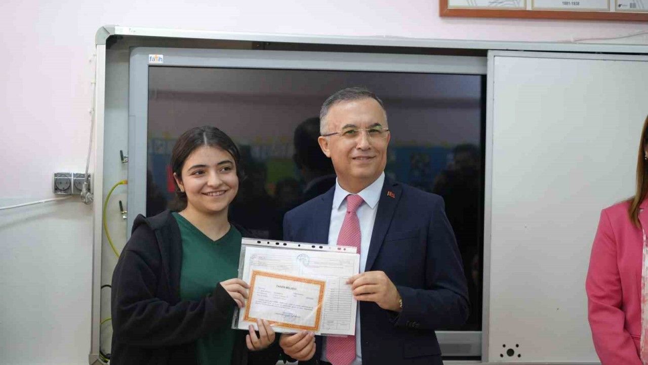 Vali Kemal Çeber ve Gaziantep İl Milli Eğitim Müdürü Yasin Tepe, Şehitkamil ilçesindeki Osmangazi Ortaokulu’nda düzenlenen programda öğrencilere karnelerini verdi.