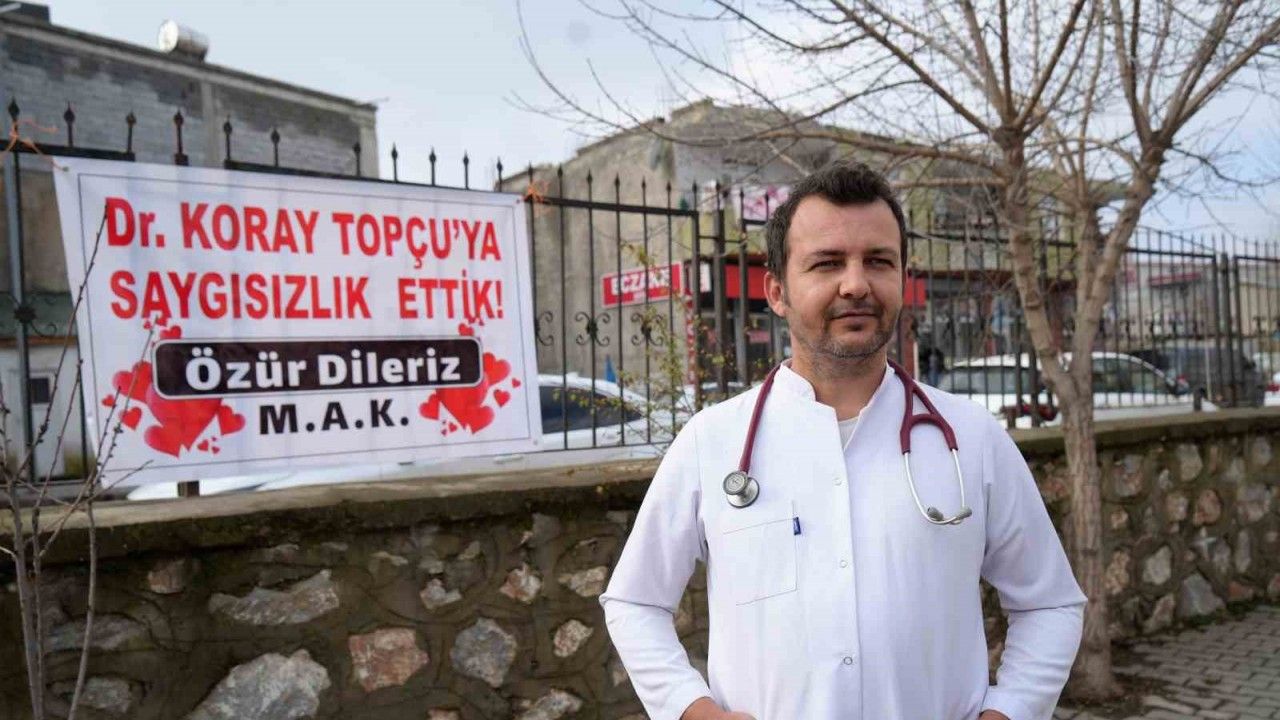 Hasköy İlçe Toplum Sağlığı Merkezinde aile hekimi olarak çalışan Dr. Koray Topçu (41), hasta muayene ettiği esnada hasta ve hasta yakını ile aralarında yaşanan tartışma tatlıya bağlandı. Yaptıkları davranıştan pişmanlık duyan hasta ve hasta yakını, doktorun gönlünü almayı bildi. Yaşanılan tartışmayı tatlıya bağlamak için hasta ve hasta yakını, toplum sağlığı merkezinin bahçe duvarının korkuluklarına bir pankart asttı. “Dr. Koray Topçu’ya saygısızlık ettik! Özür dileriz. M.A.K.” yazılı pankart Dr. Topçu’yu duygulandırırken, çevredeki vatandaşların ise takdirini topladı.